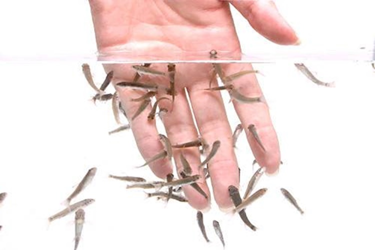 水槽に手を入れると、ガラ・ルファがたくさん集まってきて、小さな口でつんつんと皮膚の角質を食べ始めます。くすぐったくてとても気持ちいいので、ぜひお試しください。